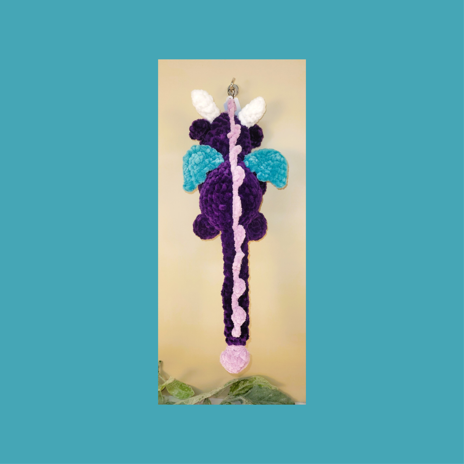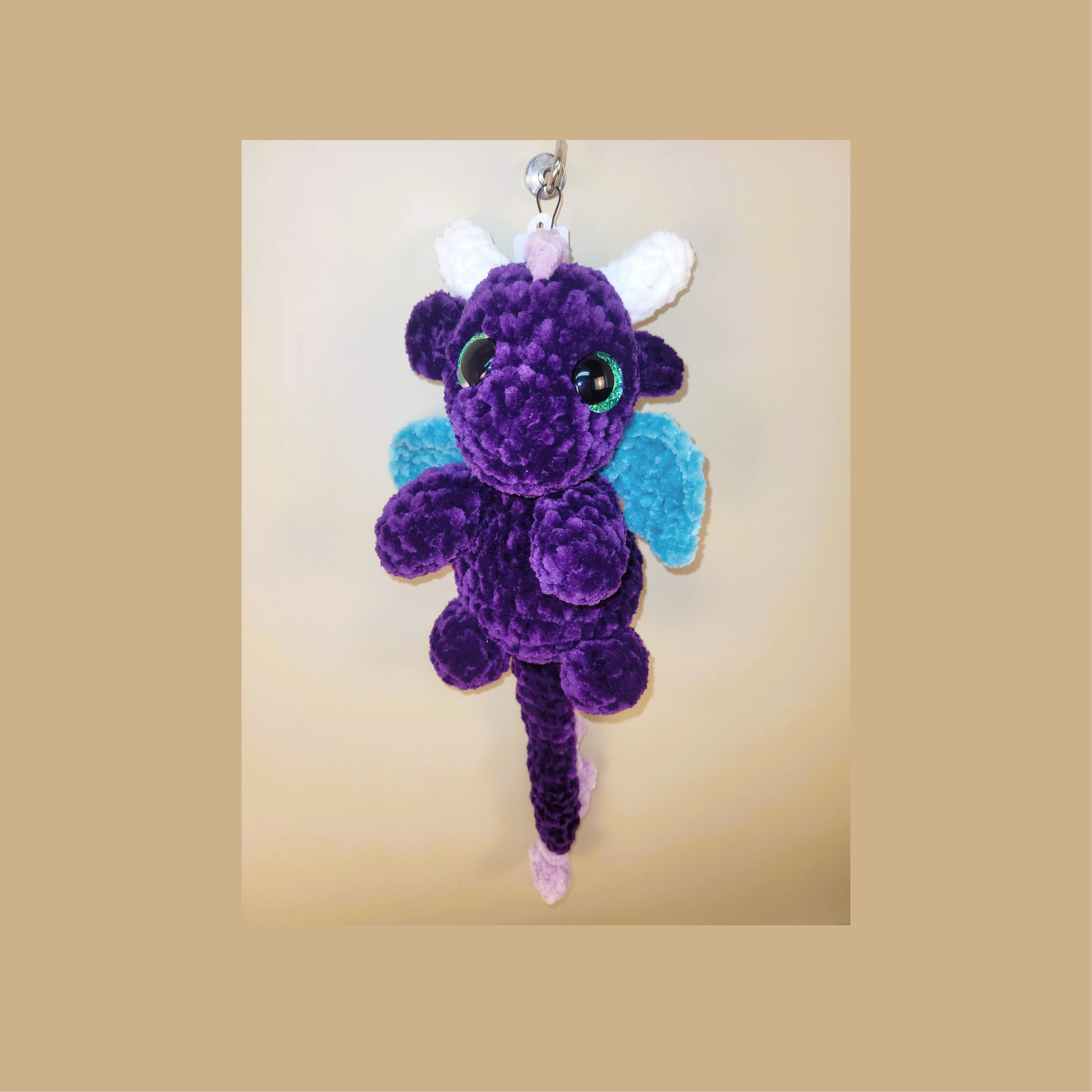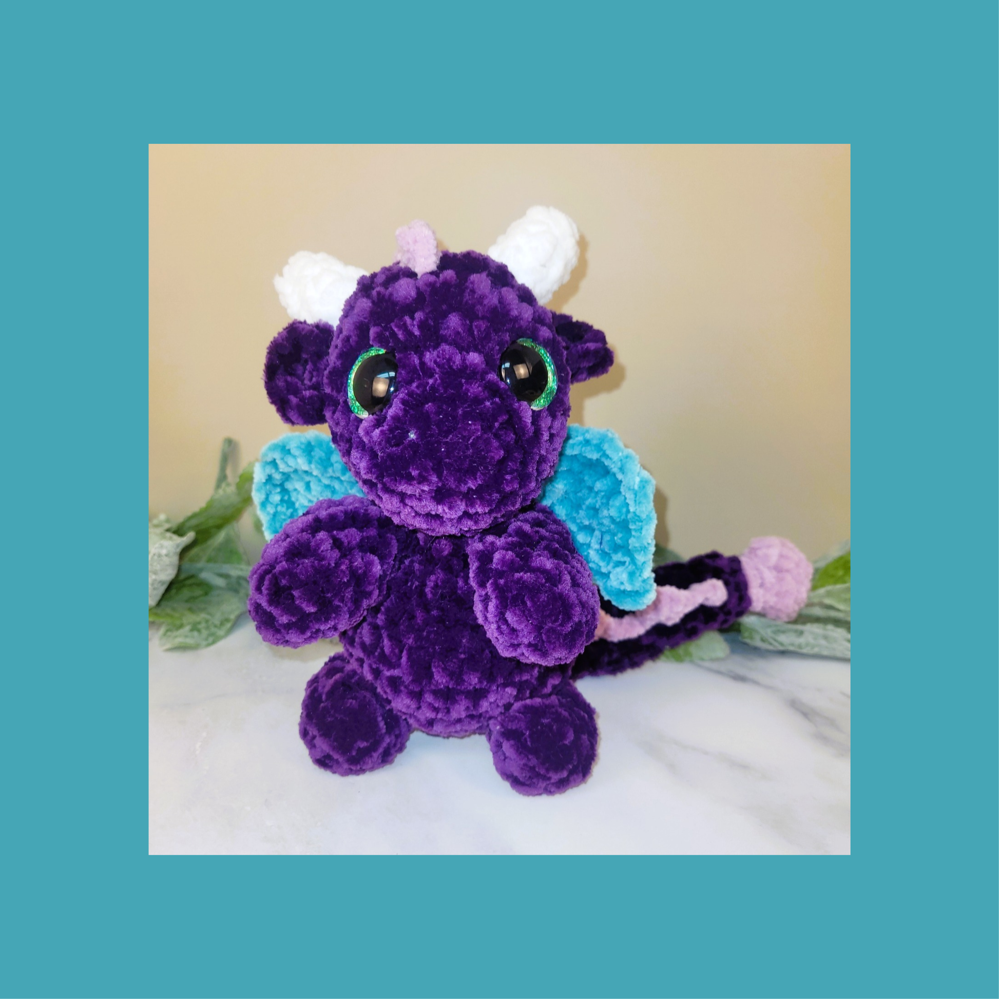 Meet Baby Jubilee, an adorable, crocheted dragon crafted from luxuriously soft velvet chenille yarn that begs to be cuddled. With sparkling green safety eyes full of personality and a plush, huggable body, this little dragon makes the perfect companion for playtime, nap time or as a heartfelt handmade gift. Each stitch is crafted with care, creating a gentle friend that's as delightful to hold as it is to admire.