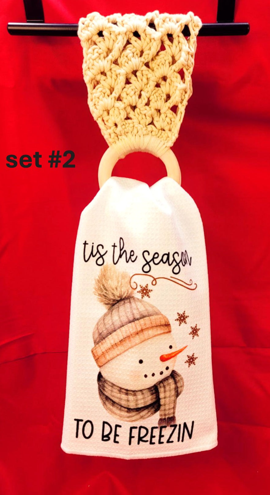 This crocheted towel holder set features sturdy wooden loops combined with thick polyester yarn, designed to securely hang over oven handles or cabinet knobs. The set includes two cotton-blend printed towels, providing both practicality and style for your kitchen. Durable and easy to install, this holder keeps towels within reach while adding a handcrafted touch to your space.