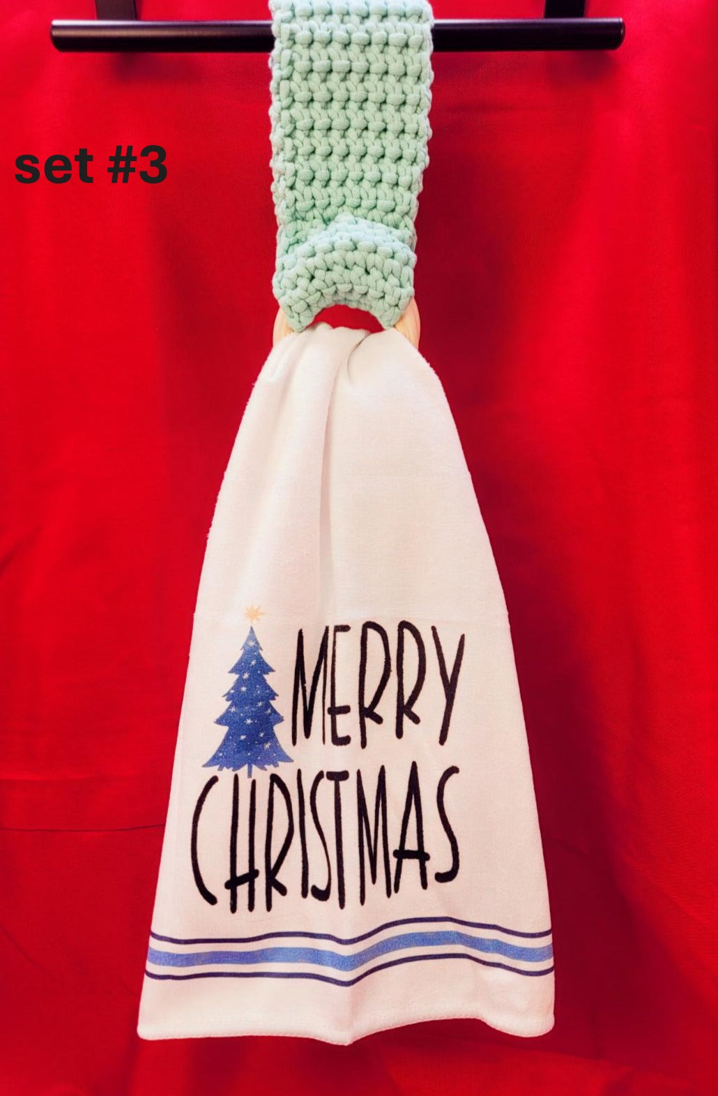 This crocheted towel holder set features sturdy wooden loops combined with thick polyester yarn, designed to securely hang over oven handles or cabinet knobs. The set includes two cotton-blend printed towels, providing both practicality and style for your kitchen. Durable and easy to install, this holder keeps towels within reach while adding a handcrafted touch to your space.