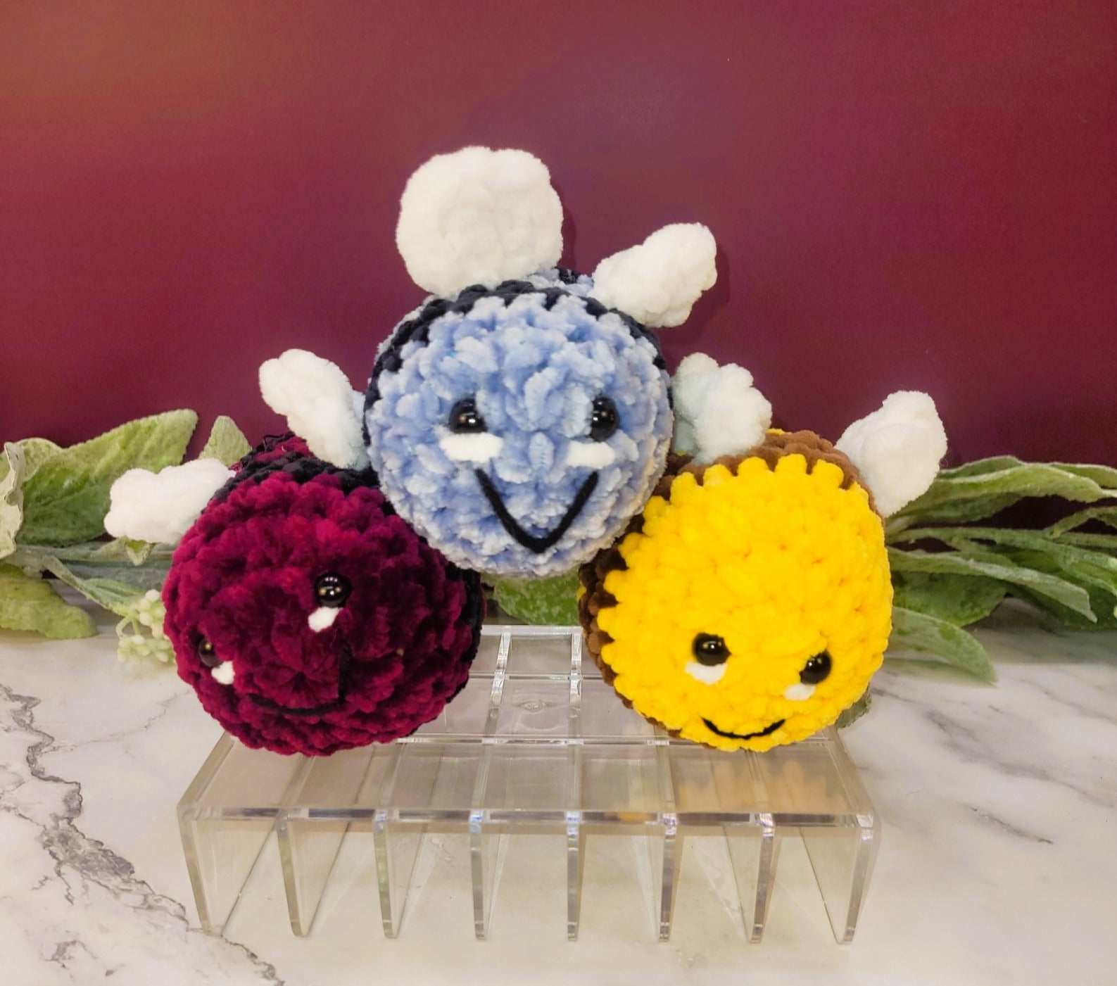 Meet your new favorite pocket-sized companion! These adorable Mini Buzz Bees are handcrafted with ultra-soft blanket yarn that's gentle to touch. Each bee features charming safety eyes, delicate crocheted wings, and an embroidered smile that radiates personality. Perfect for gifting, collecting, or keeping as a cheerful desk buddy, these little buzzers bring warmth and whimsy to any space. Handmade with care and attention to detail, they're the sweet addition your collection has been waiting for.