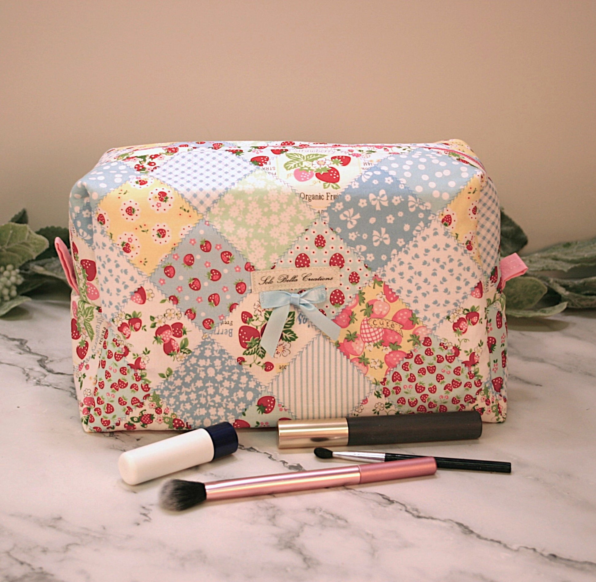 The Blue Strawberry Patch boxy bag features a patchwork design with strawberries and flowers as the main fabric with a pretty pink fabric as the inner lining.