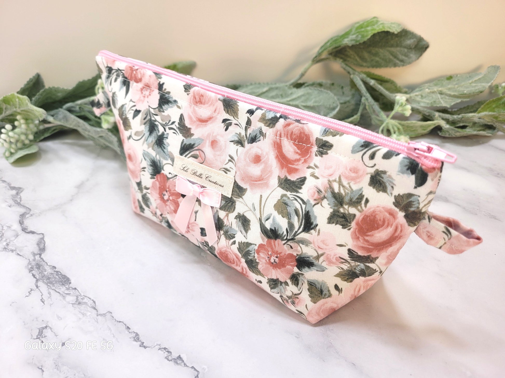 The Rose Garden pouch features roses in bloom pattern with a white inner liner